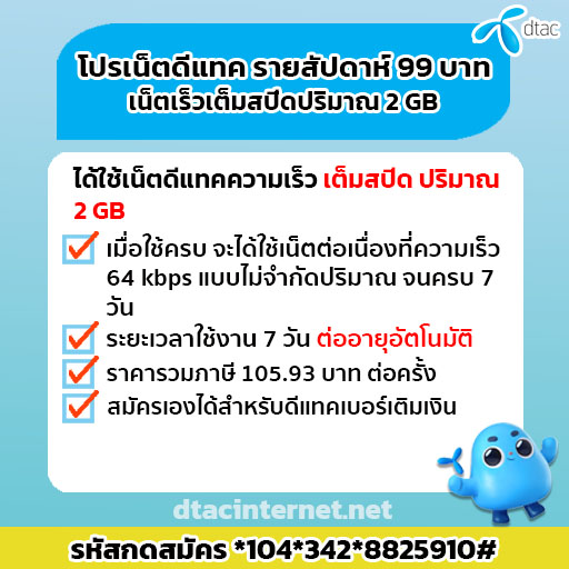 โปรเน็ตดีแทครายสัปดาห์ 99 บาท ความเร็วเน็ตไม่ลดสปีด Dtacinternet 4 ปี ago โปรเน็ตดีแทคเติมเงิน โปรเน็ตดีแทครายสัปดาห์ 99 บาท ความเร็วเน็ตไม่ลดสปีด โปรเน็ต รายสัปดาห์ ความเร็วเน็ตเต็มสปีด ราคาเพียง 99 บาท เล่น โซเชียว ไลน์ เฟสบุ๊ค อินสตาร์แกรม หรือท่องเว็ปไซร์ต่างๆ youtube ได้นานถึง 7 วัน คุณสามารถกดสมัครเองได้เลย