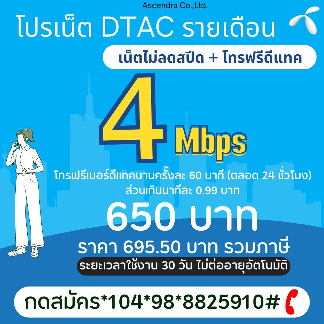 สมัครเน็ตดีแทค รายเดือน 650 บาท รวมภาษี ความเร็ว 4 Mbps+โทรฟรีดีแทคสุดคุ้ม เน็ต+ค่าโทร แพ็คเกจคุ้มๆ สุดเจ๋ง รายเดือน ไปดูรายละเอียดกันนะคะ